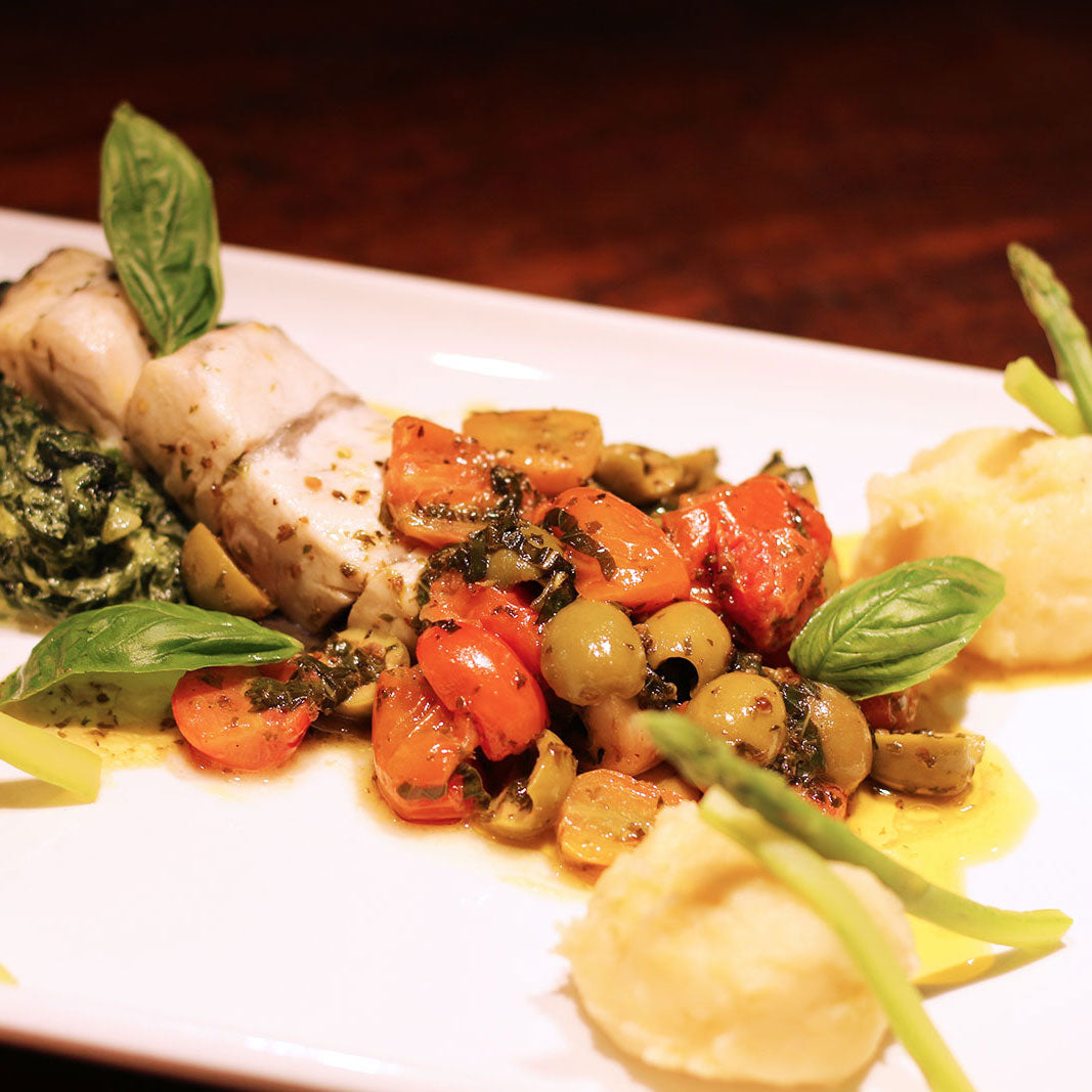 Seabass Served with Cherry Tomato Sauce, Green Olives